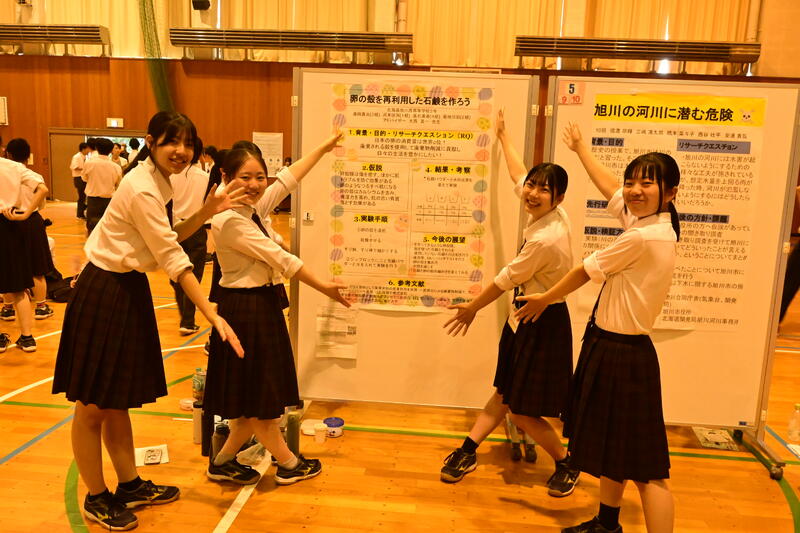 本年度研究を始めた理数科2年次生の中間発表会。同級生や先生方、SSHにご協力いただいているSSH運営指導委員の先生方、旭医大や旭教大等の先生方から質問をうけ、その場でロジカルに回答する練習となりました。それぞれが発表を分担したり、質問に対しては慌てることなくチームで話し合い論を立てて回答していました。ここで見つかった課題に対しては更に仮説を立て、探求の過程は繰り返し続いていきます。